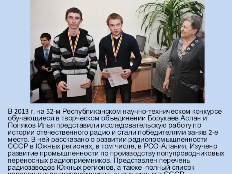объединении Борукаев Аслан и Поляков Илья представили исследовательскую работу по истории отечественного радио и стали победителями заняв 2-е место. В ней рассказано о развитии радиопромышленности СССР в Южных регионах, в том числе, в РСО-Алания. Изучено развитие промышленности по производству полупроводниковых переносных радиоприёмников. Представлен перечень радиозаводов Южных регионов, а также полный список переносных радиоприёмников, выпущенных в СССР.