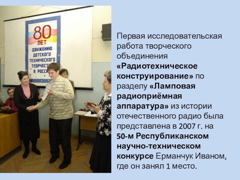 аппаратура» из истории отечественного радио была представлена в 2007 г. на 50-м Республиканском научно-техническом конкурсе Ерманчук Иваном, где он занял 1 место.