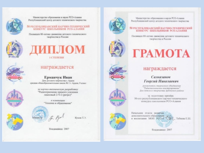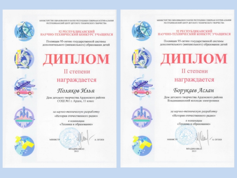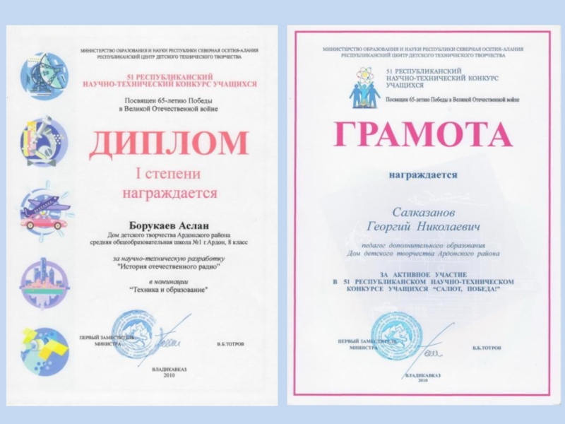 51-м Республиканском научно-техническом конкурсе в 2010 г., где представлены материалы по рождению радио, возникновению радиопромышленности в России. Рассмотрены вопросы радиоаппаратостроения в период Великой отечественной войны, развитие эфирного радиовещания. Исследовано развитие военной аппаратуры связи. Работу выполнил Борукаев Аслан и занял 1 место.