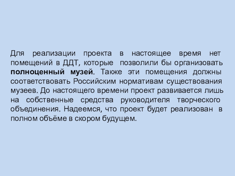 позволили бы организовать полноценный музей. Также эти помещения должны соответствовать Российским нормативам существования музеев. До настоящего времени проект развивается лишь на собственные средства руководителя творческого объединения. Надеемся, что проект будет реализован в полном объёме в скором будущем.