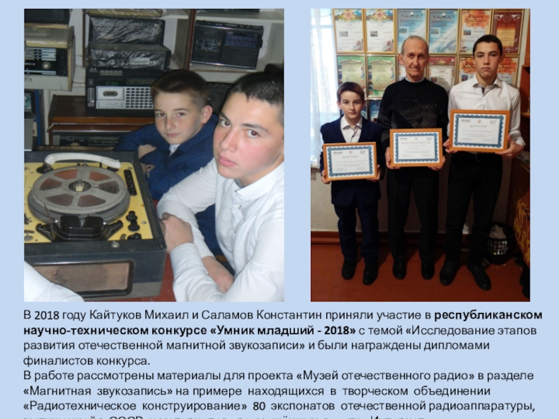 республиканском научно-техническом конкурсе «Умник младший - 2018» с темой «Исследование этапов развития отечественной магнитной звукозаписи» и были награждены дипломами финалистов конкурса.
