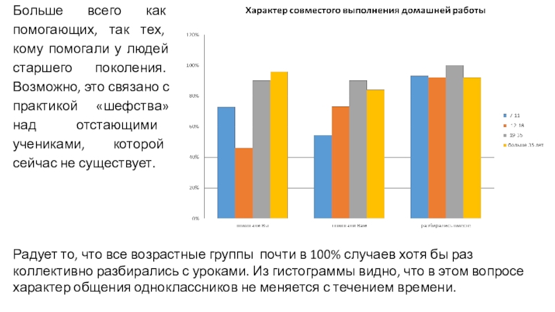 Радует то, что все возрастные группы почти в 100% случаев хотя бы раз коллективно разбирались с уроками. Из гистограммы видно, что в этом вопросе характер общения одноклассников не меняется с течением времени.