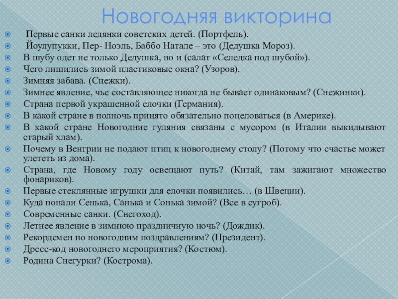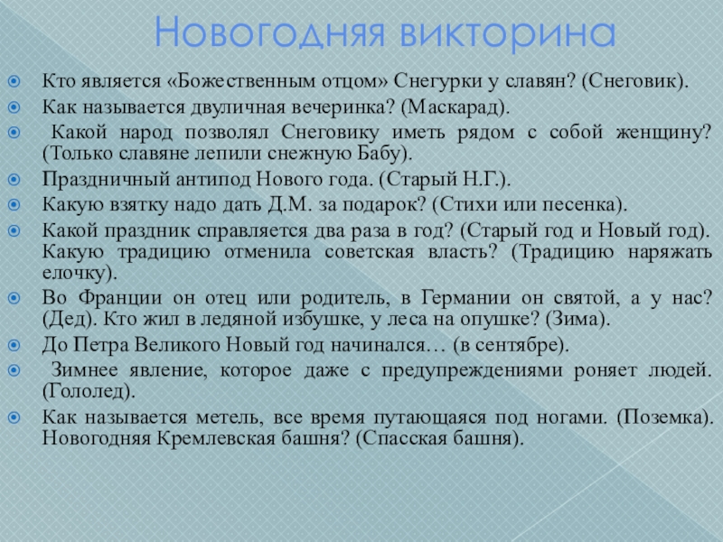 Какой праздник справляется два раза в год? (Старый год и Новый год). Какую традицию отменила советская власть? (Традицию наряжать елочку).