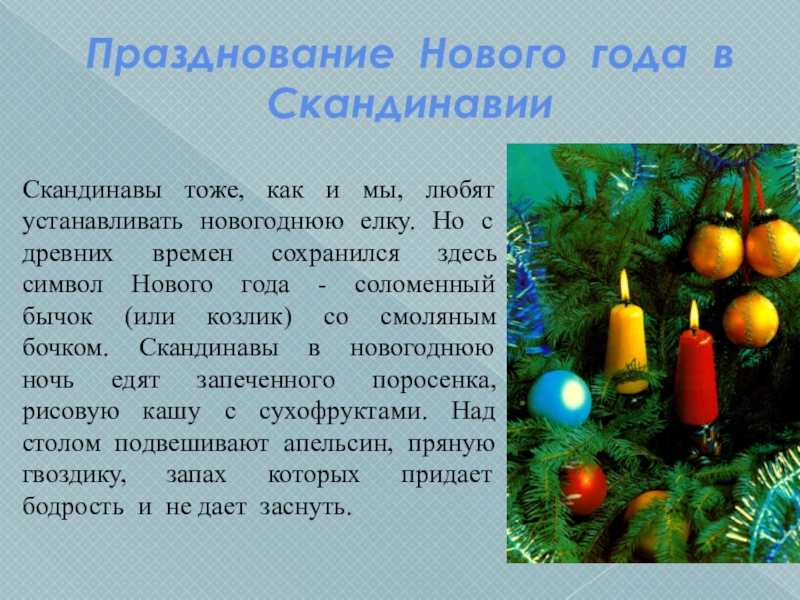 новогоднюю елку. Но с древних времен сохранился здесь символ Нового года - соломенный бычок (или козлик) со смоляным бочком. Скандинавы в новогоднюю ночь едят запеченного поросенка, рисовую кашу с сухофруктами. Над столом подвешивают апельсин, пряную гвоздику, запах которых придает бодрость и не дает заснуть.