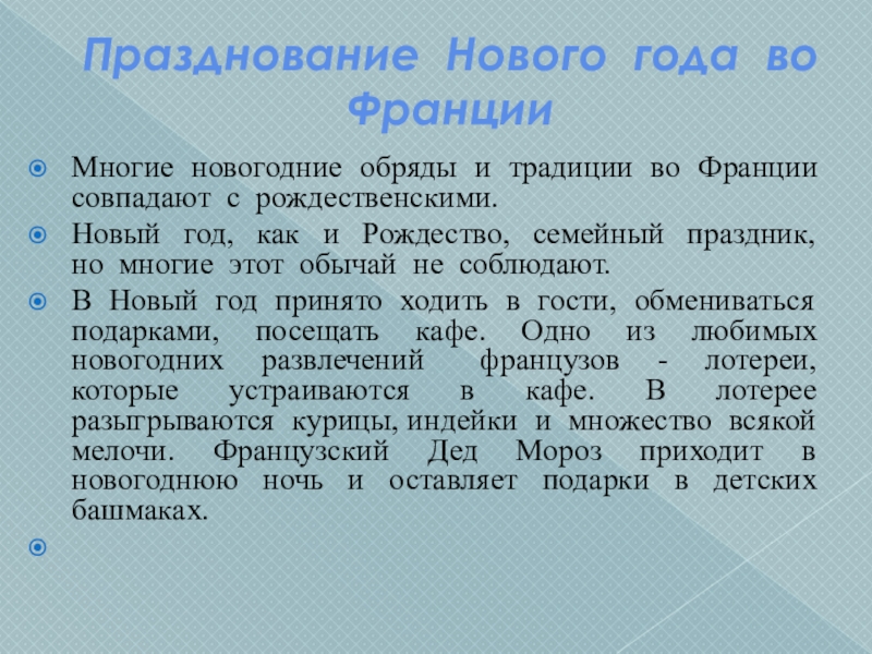 В Новый год принято ходить в гости, обмениваться подарками, посещать кафе. Одно из любимых новогодних развлечений французов - лотереи, которые устраиваются в кафе. В лотерее разыгрываются курицы, индейки и множество всякой мелочи. Французский Дед Мороз приходит в новогоднюю ночь и оставляет подарки в детских башмаках.