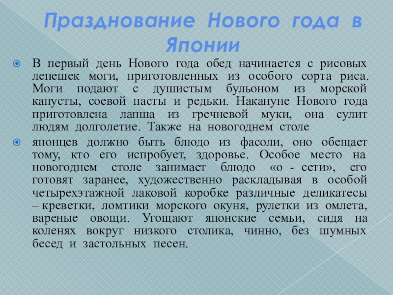 японцев должно быть блюдо из фасоли, оно обещает тому, кто его испробует, здоровье. Особое место на новогоднем столе занимает блюдо «о - сети», его готовят заранее, художественно раскладывая в особой четырехэтажной лаковой коробке различные деликатесы – креветки, ломтики морского окуня, рулетки из омлета, вареные овощи. Угощают японские семьи, сидя на коленях вокруг низкого столика, чинно, без шумных бесед и застольных песен.