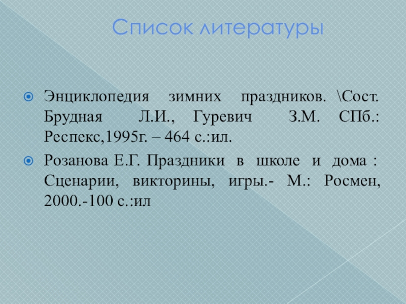 Энциклопедия зимних праздников. \Сост. Брудная Л.И., Гуревич З.М. СПб.:Респекс,1995г.