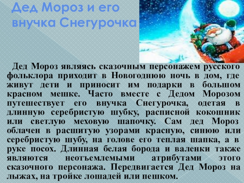 сказочным персонажем русского фольклора приходит в Новогоднюю ночь в дом, где живут дети и приносит им подарки в большом красном мешке. Часто вместе с Дедом Морозом путешествует его внучка Снегурочка, одетая в длинную серебристую шубку, расписной кокошник или светлую меховую шапочку. Сам дед Мороз облачен в расшитую узорами красную, синюю или серебристую шубу, на голове его теплая шапка, а в руке посох. Длинная белая борода и валенки также являются неотъемлемыми атрибутами этого сказочного персонажа. Передвигается Дед Мороз на лыжах, на тройке лошадей или пешком.