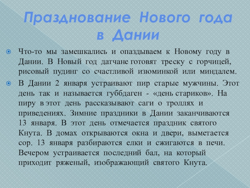 году в Дании. В Новый год датчане готовят треску с горчицей, рисовый пудинг со счастливой изюминкой или миндалем.
