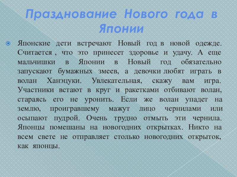 одежде. Считается , что это принесет здоровье и удачу. А еще мальчишки в Японии в Новый год обязательно запускают бумажных змеев, а девочки любят играть в волан Ханэцуки. Увлекательная, скажу вам игра. Участники встают в круг и ракетками отбивают волан, стараясь его не уронить. Если же волан упадет на землю, проигравшему мажут лицо чернилами или осыпают пудрой. Очень трудно отмыть эти чернила. Японцы помешаны на новогодних открытках. Никто на всем свете не отправляет столько новогодних открыток, как японцы.