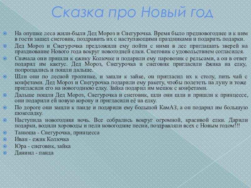 Шли они по лесной тропинке, и зашли к зайке, он пригласил их к столу, пить чай с конфетами. Дед Мороз и Снегурочка подарили ему ракету, чтобы полететь на луну и тоже пригласили его на новогоднюю елку. Зайка подарил им мешок с конфетами.