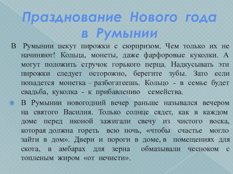 В Румынии новогодний вечер раньше назывался вечером на святого Василия. Только солнце сядет, как в каждом доме перед иконой зажигали свечу из чистого воска, которая должна гореть всю ночь, «чтобы счастье могло зайти в дом». Двери и пороги в доме, в помещениях для скота, в амбарах для зерна обмазывали чесноком с топленым жиром «от нечисти».