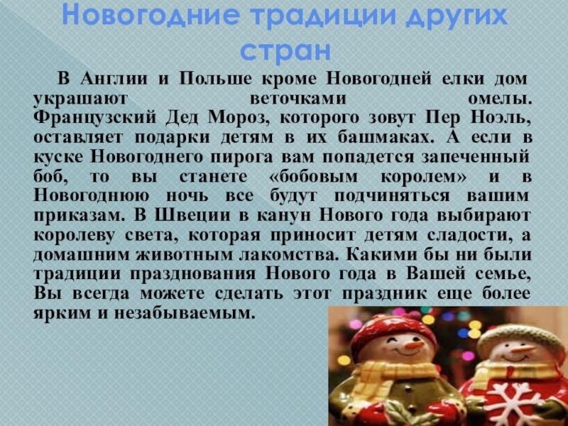 Французский Дед Мороз, которого зовут Пер Ноэль, оставляет подарки детям в их башмаках. А если в куске Новогоднего пирога вам попадется запеченный боб, то вы станете «бобовым королем» и в Новогоднюю ночь все будут подчиняться вашим приказам. В Швеции в канун Нового года выбирают королеву света, которая приносит детям сладости, а домашним животным лакомства. Какими бы ни были традиции празднования Нового года в Вашей семье, Вы всегда можете сделать этот праздник еще более ярким и незабываемым.