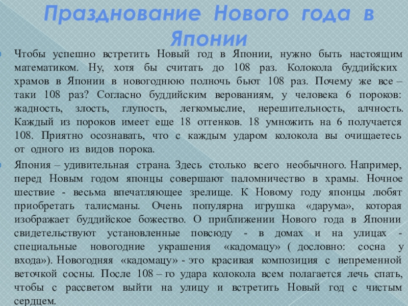 нужно быть настоящим математиком. Ну, хотя бы считать до 108 раз. Колокола буддийских храмов в Японии в новогоднюю полночь бьют 108 раз. Почему же все – таки 108 раз? Согласно буддийским верованиям, у человека 6 пороков: жадность, злость, глупость, легкомыслие, нерешительность, алчность. Каждый из пороков имеет еще 18 оттенков. 18 умножить на 6 получается 108. Приятно осознавать, что с каждым ударом колокола вы очищаетесь от одного из видов порока.