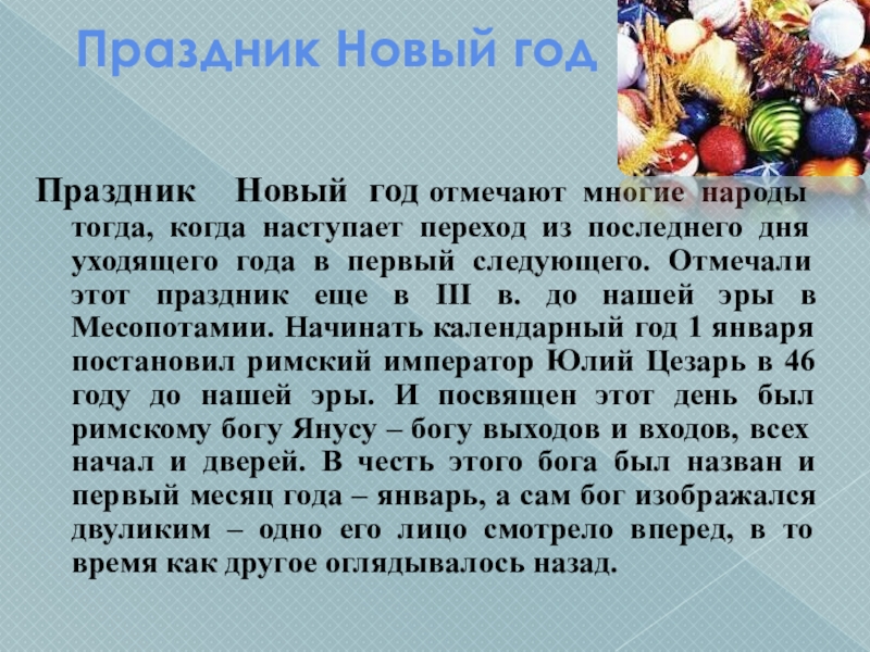из последнего дня уходящего года в первый следующего. Отмечали этот праздник еще в III в. до нашей эры в Месопотамии. Начинать календарный год 1 января постановил римский император Юлий Цезарь в 46 году до нашей эры. И посвящен этот день был римскому богу Янусу – богу выходов и входов, всех начал и дверей. В честь этого бога был назван и первый месяц года – январь, а сам бог изображался двуликим – одно его лицо смотрело вперед, в то время как другое оглядывалось назад.