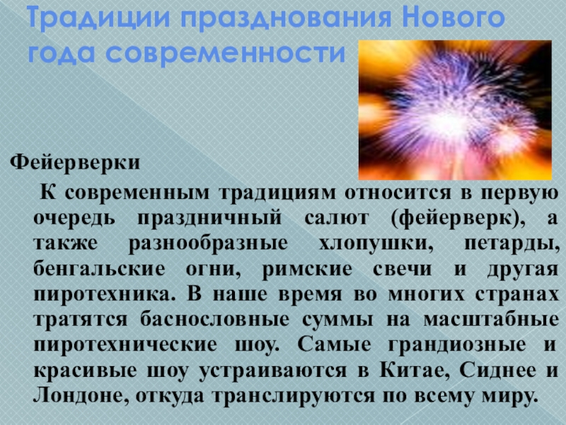 первую очередь праздничный салют (фейерверк), а также разнообразные хлопушки, петарды, бенгальские огни, римские свечи и другая пиротехника. В наше время во многих странах тратятся баснословные суммы на масштабные пиротехнические шоу. Самые грандиозные и красивые шоу устраиваются в Китае, Сиднее и Лондоне, откуда транслируются по всему миру.
