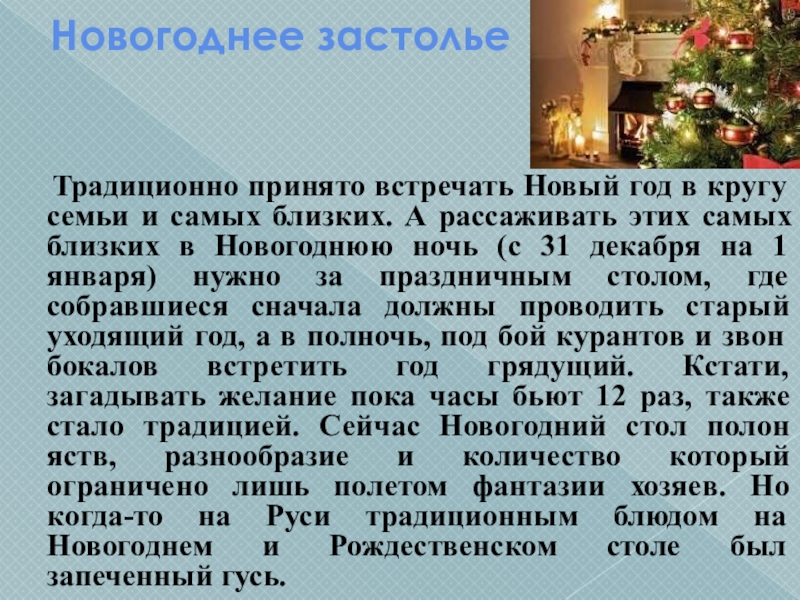 и самых близких. А рассаживать этих самых близких в Новогоднюю ночь (с 31 декабря на 1 января) нужно за праздничным столом, где собравшиеся сначала должны проводить старый уходящий год, а в полночь, под бой курантов и звон бокалов встретить год грядущий. Кстати, загадывать желание пока часы бьют 12 раз, также стало традицией. Сейчас Новогодний стол полон яств, разнообразие и количество который ограничено лишь полетом фантазии хозяев. Но когда-то на Руси традиционным блюдом на Новогоднем и Рождественском столе был запеченный гусь.