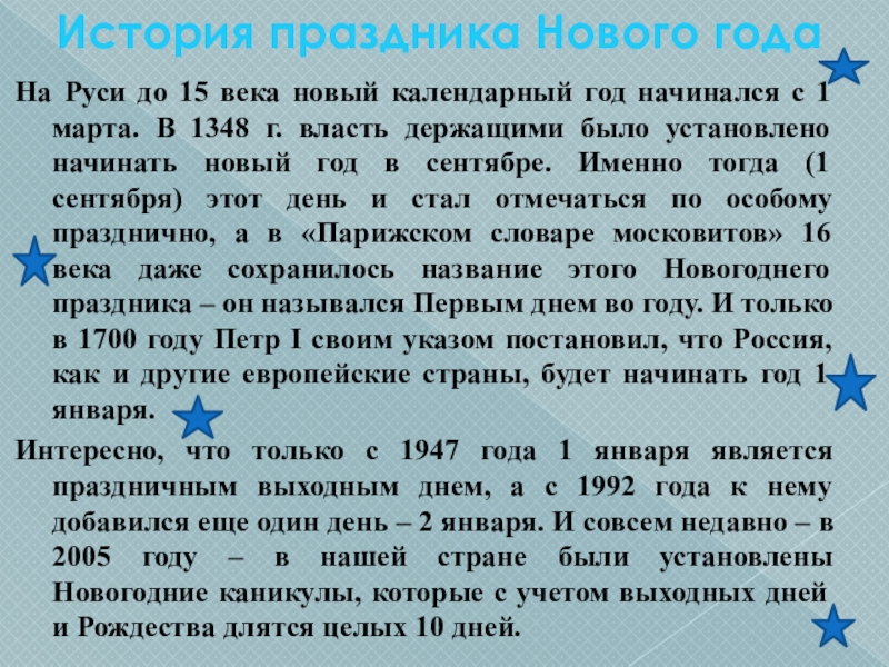 Цель работы: узнать историю возникновения Новогодних праздников в России и