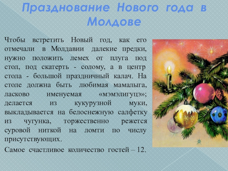 в Молдавии далекие предки, нужно положить лемех от плуга под стол, под скатерть - солому, а в центр стола - большой праздничный калач. На столе должна быть любимая мамалыга, ласково именуемая «мэмэлигуцэ»; делается из кукурузной муки, выкладывается на белоснежную салфетку из чугунка, торжественно режется суровой ниткой на ломти по числу присутствующих.