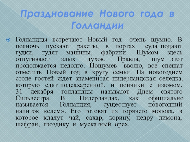 В полночь пускают ракеты, в портах суда подают гудки, гудят машины, фабрики. Шумом здесь отпугивают злых духов. Правда, шум этот продолжается недолго. Пошумев вволю, все спешат отметить Новый год в кругу семьи. На новогоднем столе гостей ждет знаменитая нидерландская селедка, которую едят подсахаренной, и пончики с изюмом. 31 декабря голландцы называют Днем святого Сильвестра. В Нидерландах, как официально называется Голландия, существует новогодний напиток «слем». Его готовят из горячего молока, в которое кладут чай, сахар, корицу, цедру лимона, шафран, гвоздику и мускатный орех.