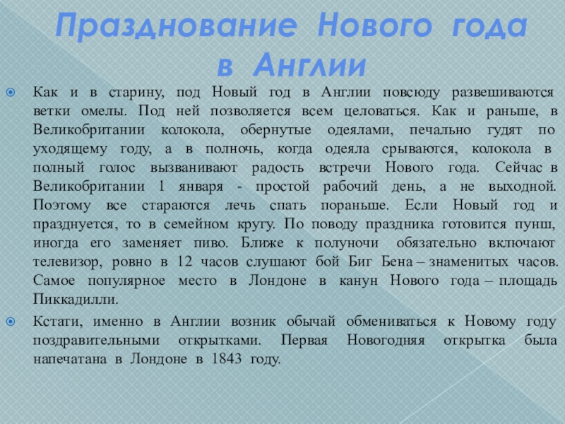 в Англии повсюду развешиваются ветки омелы. Под ней позволяется всем целоваться. Как и раньше, в Великобритании колокола, обернутые одеялами, печально гудят по уходящему году, а в полночь, когда одеяла срываются, колокола в полный голос вызванивают радость встречи Нового года. Сейчас в Великобритании 1 января - простой рабочий день, а не выходной. Поэтому все стараются лечь спать пораньше. Если Новый год и празднуется, то в семейном кругу. По поводу праздника готовится пунш, иногда его заменяет пиво. Ближе к полуночи обязательно включают телевизор, ровно в 12 часов слушают бой Биг Бена – знаменитых часов. Самое популярное место в Лондоне в канун Нового года – площадь Пиккадилли.