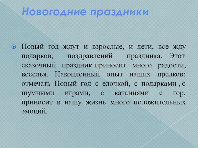 подарков, поздравлений праздника. Этот сказочный праздник приносит много радости, веселья. Накопленный опыт наших предков: отмечать Новый год с елочкой, с подарками , с шумными играми, с катаниями с гор, приносит в нашу жизнь много положительных эмоций.