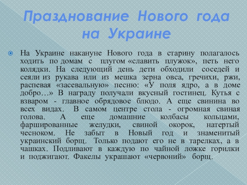 полагалось ходить по домам с плугом «славить плужок», петь него колядки. На следующий день дети обходили соседей и сеяли из рукава или из мешка зерна овса, гречихи, ржи, распевая «засевальную» песню: «У поля ядро, а в доме добро…» В награду получали вкусный гостинец. Кутья с взваром - главное обрядовое блюдо. А еще свинина во всех видах. В самом центре стола - огромная свиная голова. А еще домашние колбасы кольцами, фаршированные желудки, свиной окорок, натертый чесноком. Не забыт в Новый год и знаменитый украинский борщ. Только подают его не в тарелках, а в чашках. Подливают в каждую по чайной ложке горилки и поджигают. Факелы украшают «червоний» борщ.
