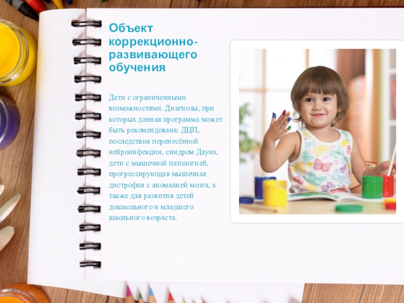 Объект коррекционно-развивающего обучения Дети с ограниченными возможностями. Диагнозы, при которых данная программа может быть рекомендована: ДЦП, последствия