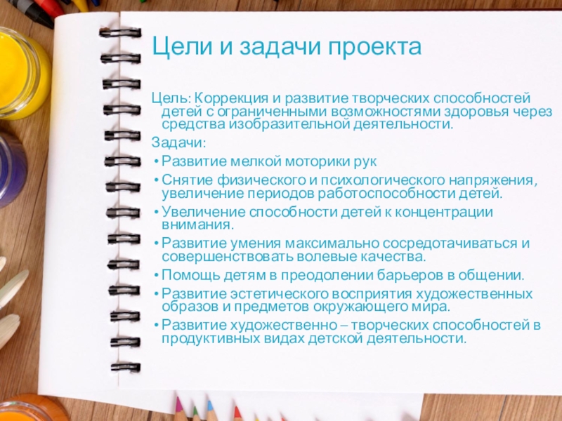 Цели и задачи проектаЦель: Коррекция и развитие творческих способностей детей с ограниченными возможностями здоровья через средства изобразительной