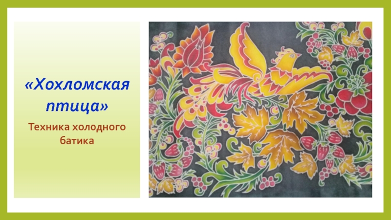 выполнить стилизацию птицы и растительных элементов хохломской росписи в декоративной композиции холодного батика.