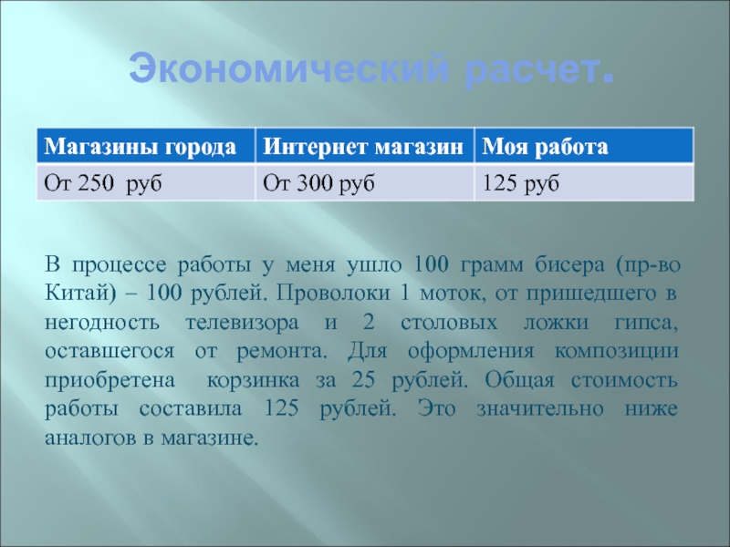 бисера (пр-во Китай) – 100 рублей. Проволоки 1 моток, от пришедшего в негодность телевизора и 2 столовых ложки гипса, оставшегося от ремонта. Для оформления композиции приобретена корзинка за 25 рублей. Общая стоимость работы составила 125 рублей. Это значительно ниже аналогов в магазине.