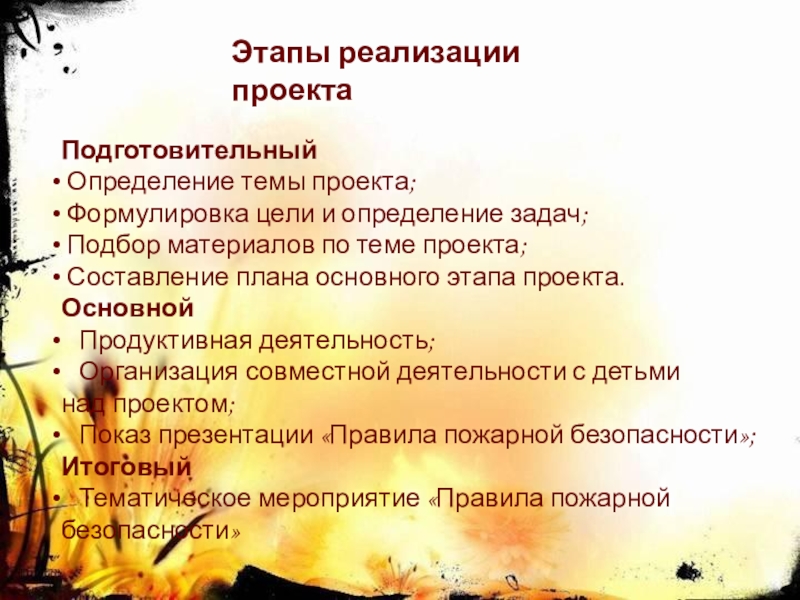 Презентация, доклад проекта Правила пожарной безопасности (Младшая группа)