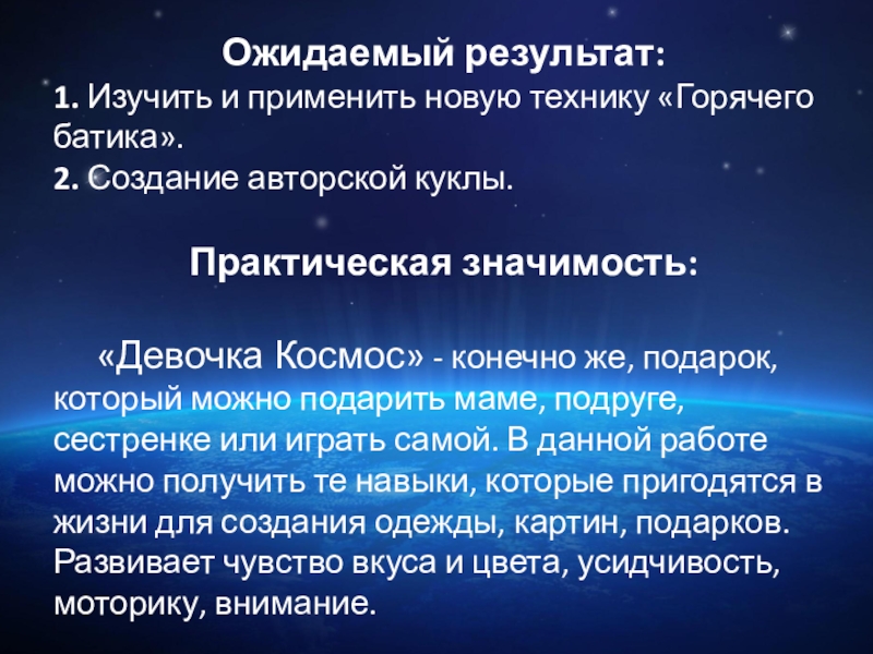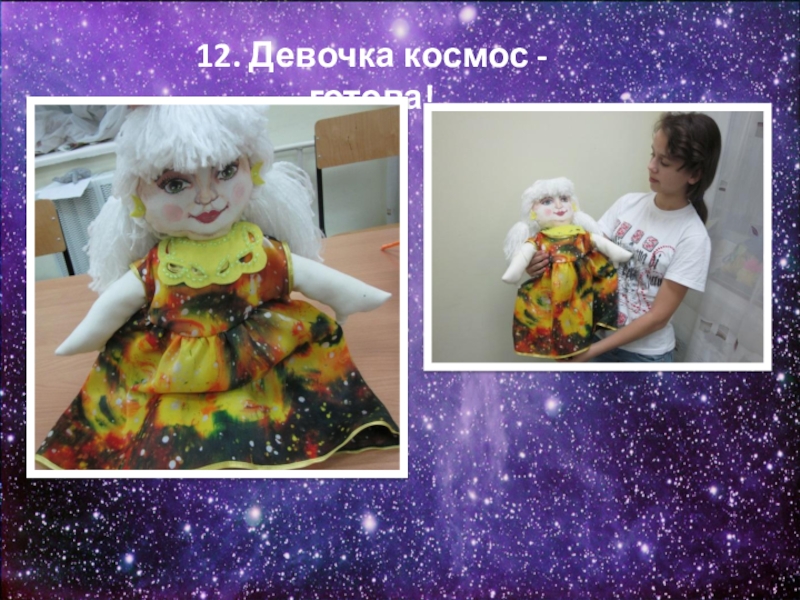 «Девочка Космос» - конечно же, подарок, который можно подарить маме, подруге, сестренке или играть самой. В данной работе можно получить те навыки, которые пригодятся в жизни для создания одежды, картин, подарков. Развивает чувство вкуса и цвета, усидчивость, моторику, внимание.