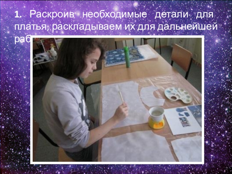 Слайд 121. Раскроив необходимые детали для платья, раскладываем их для дальнейшей работы.