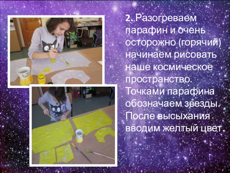 Слайд 132. Разогреваем парафин и очень осторожно (горячий) начинаем рисовать наше космическое