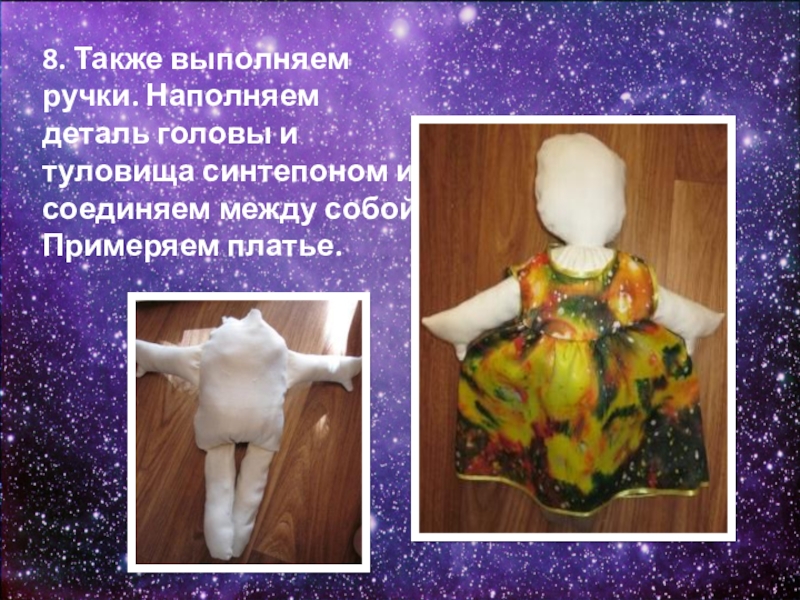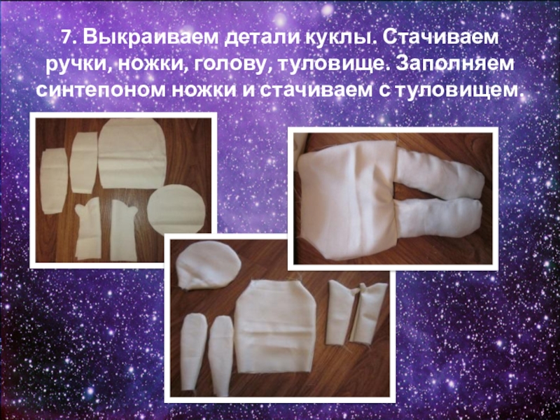 Слайд 177. Выкраиваем детали куклы. Стачиваем ручки, ножки, голову, туловище. Заполняем синтепоном