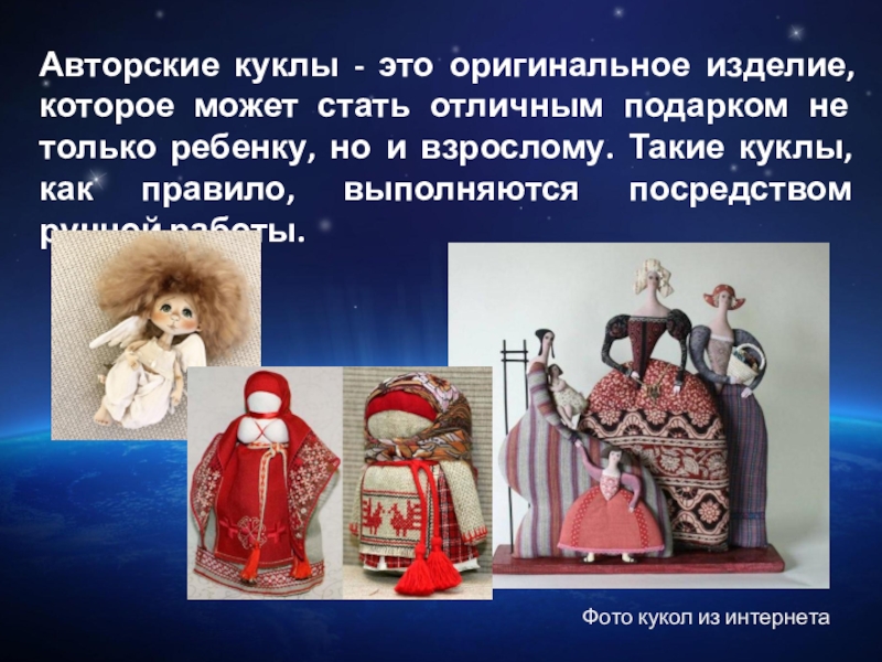 Слайд 8Авторские куклы - это оригинальное изделие, которое может стать отличным подарком