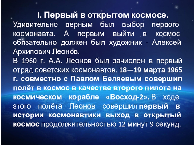 Слайд 5 I. Первый в открытом космосе.