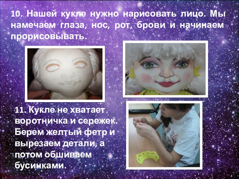 Слайд 2010. Нашей кукле нужно нарисовать лицо. Мы намечаем глаза, нос, рот,