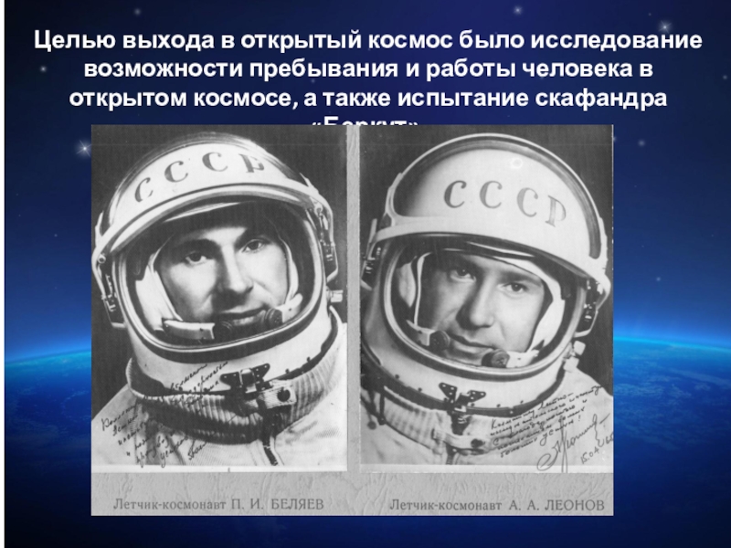 человека в открытом космосе, а также испытание скафандра «Беркут».