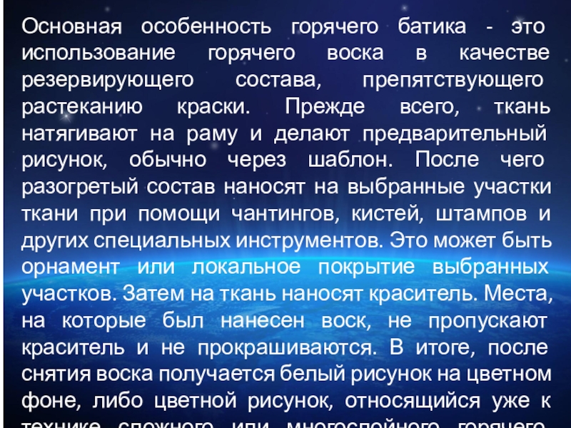 Слайд 10Основная особенность горячего батика - это использование горячего воска в качестве