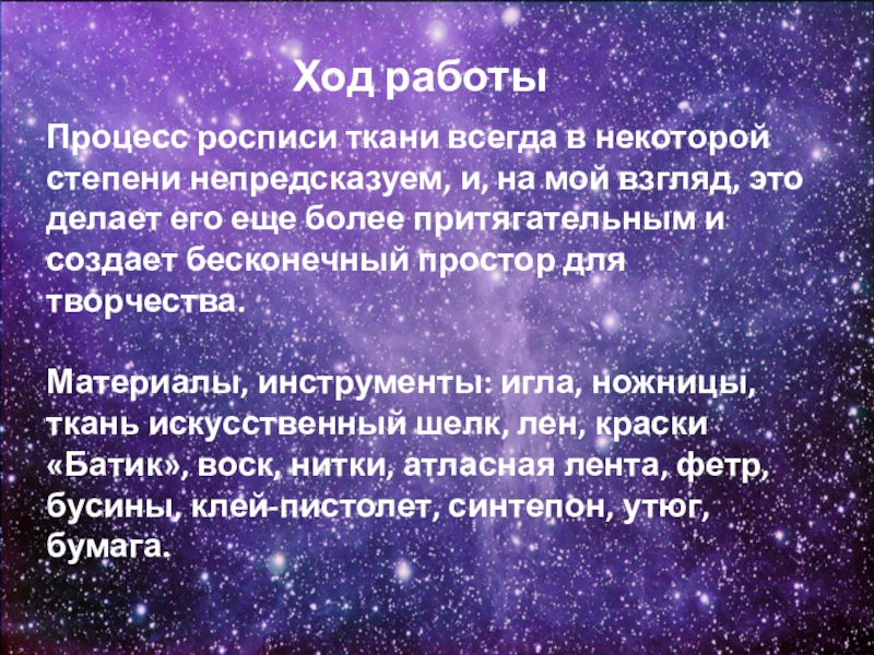Материалы, инструменты: игла, ножницы, ткань искусственный шелк, лен, краски «Батик», воск, нитки, атласная лента, фетр, бусины, клей-пистолет, синтепон, утюг, бумага.