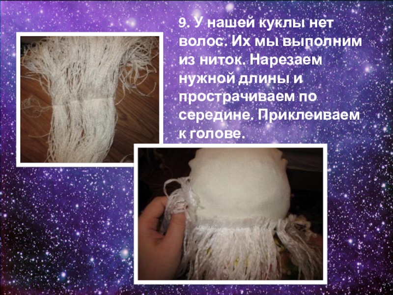 Слайд 199. У нашей куклы нет волос. Их мы выполним из ниток.