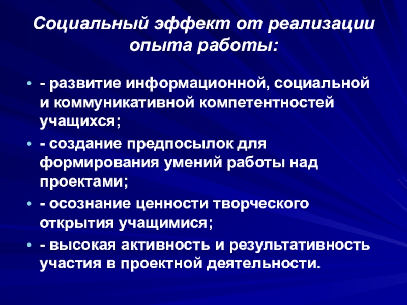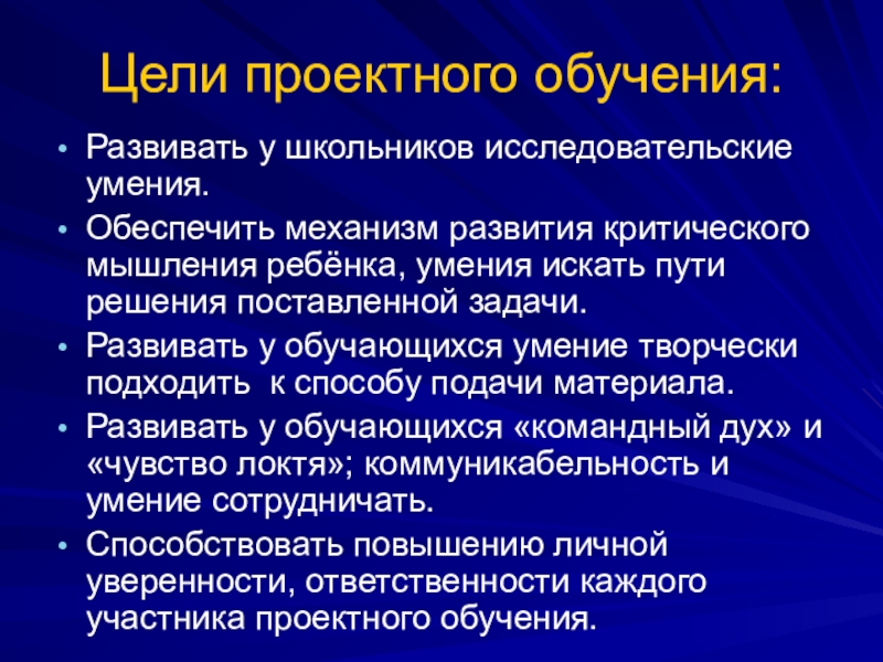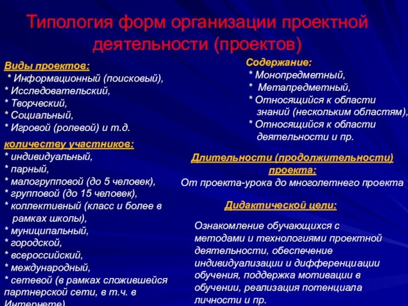 Ознакомление обучающихся с методами и технологиями проектной деятельности, обеспечение индивидуализации и дифференциации обучения, поддержка мотивации в обучении, реализация потенциала личности и пр.