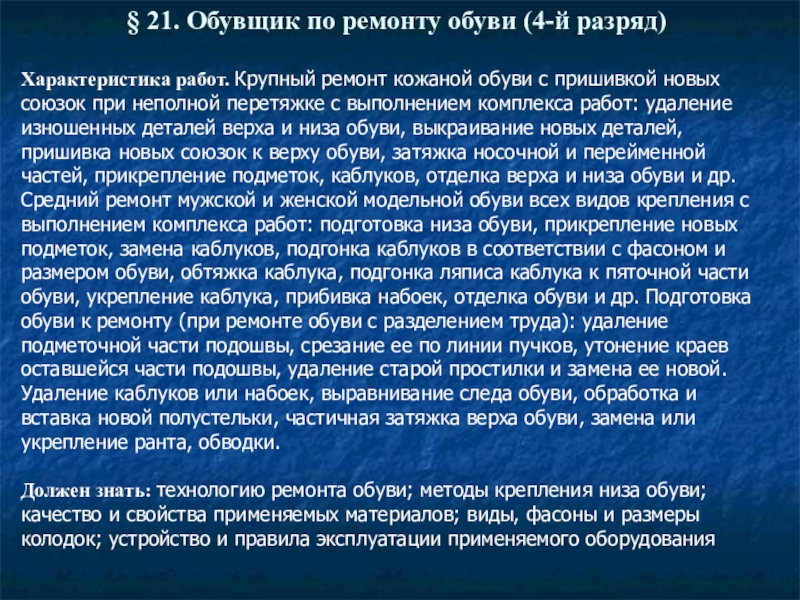 § 21. Обувщик по ремонту обуви (4-й разряд)