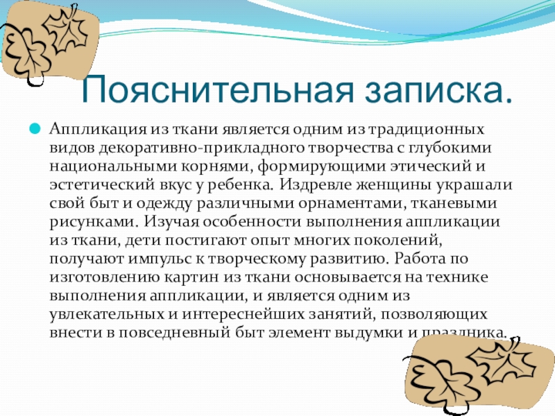 видов декоративно-прикладного творчества с глубокими национальными корнями, формирующими этический и эстетический вкус у ребенка. Издревле женщины украшали свой быт и одежду различными орнаментами, тканевыми рисунками. Изучая особенности выполнения аппликации из ткани, дети постигают опыт многих поколений, получают импульс к творческому развитию. Работа по изготовлению картин из ткани основывается на технике выполнения аппликации, и является одним из увлекательных и интереснейших занятий, позволяющих внести в повседневный быт элемент выдумки и праздника.