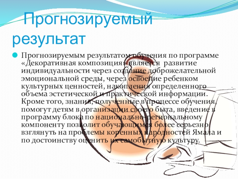 развитие индивидуальности через создание доброжелательной эмоциональной среды, через освоение ребенком культурных ценностей, накопления определенного объема эстетической и практической информации. Кроме того, знания, полученные в процессе обучения, помогут детям в организации своего быта, введение в программу блока по национально-региональному компоненту позволит обучающимся более серьезно взглянуть на проблемы коренных народностей Ямала и по достоинству оценить их самобытную культуру.