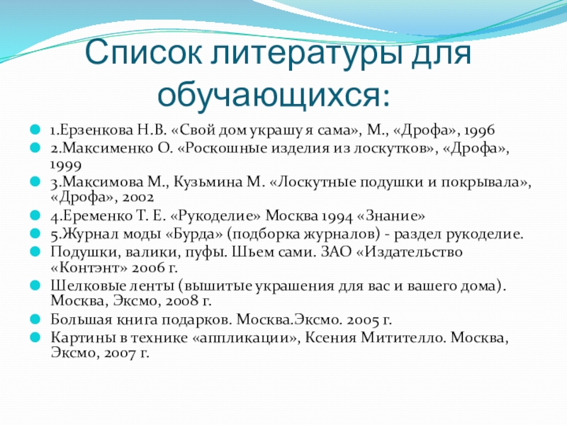 1.Ерзенкова Н.В. «Свой дом украшу я сама», М., «Дрофа», 1996