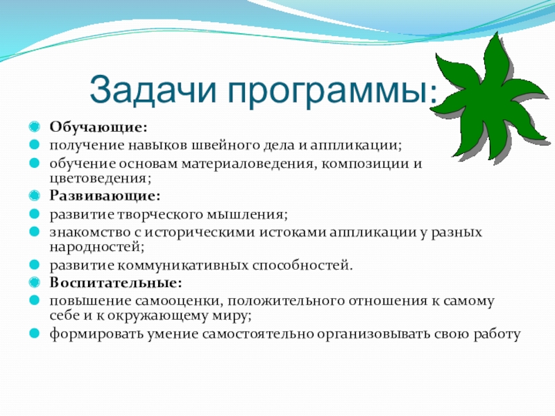 посредством декоративно-прикладного искусства и создание условий для наиболее полного раскрытия творческих способностей детей.