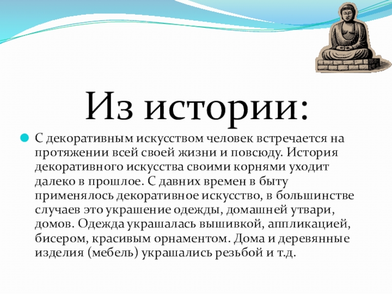 протяжении всей своей жизни и повсюду. История декоративного искусства своими корнями уходит далеко в прошлое. С давних времен в быту применялось декоративное искусство, в большинстве случаев это украшение одежды, домашней утвари, домов. Одежда украшалась вышивкой, аппликацией, бисером, красивым орнаментом. Дома и деревянные изделия (мебель) украшались резьбой и т.д.